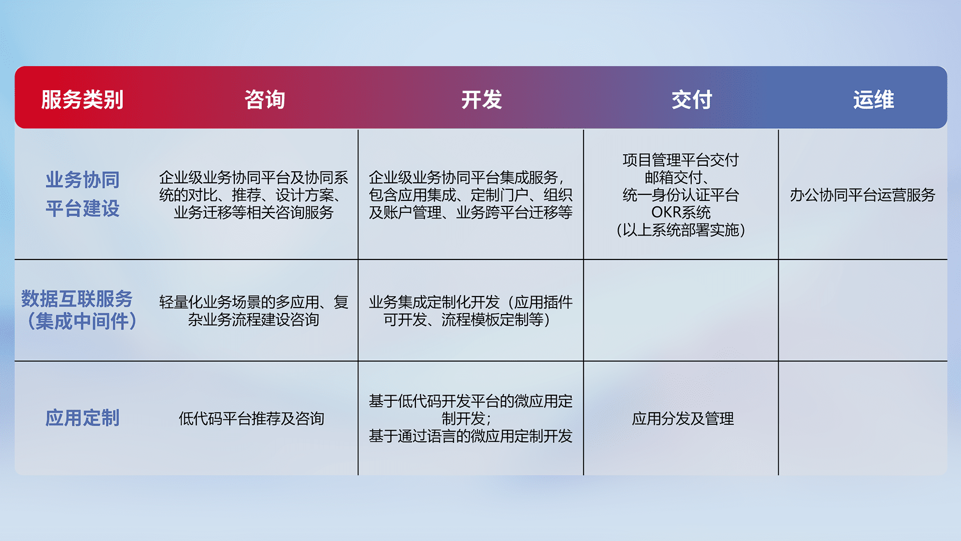 针对钉钉、、、、企微、、、、IDaas等平台级产品提供产品的规划、、方案、、、交付、、、、定制化开发等服务,,,,实现如统一协同办公、、、、智能客户服务、、混合会议管理、、、智能数据查询、、、、等业务场景,,,实现数字化转型。。