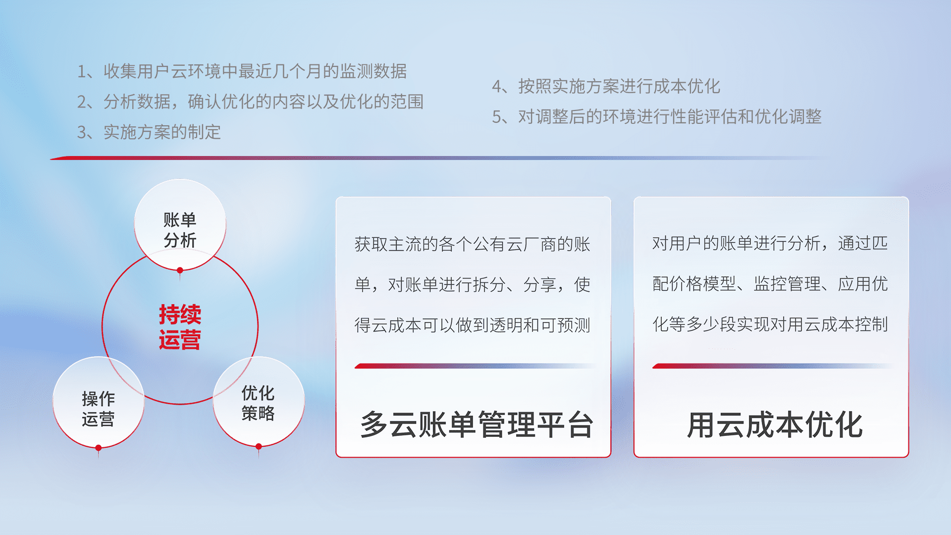通过多云纳管,,,以统一的资源数据模型把客户的云资源进行抽象和封装,,,,进而实现对多云资源的统一操作,,,,保障云资源管理的可靠性、、、、稳定性与可用性。。。。量身定制化运维内容,,,配置、、开发运维、、、补丁管理、、、备份、、监控、、、、认证和访问管理、、审计和日常巡检等,,保障在用云过程中的可靠度,,,稳定度以及高可用率。。。